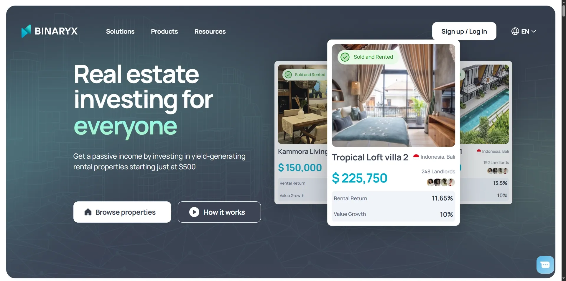 Binaryx is a Europe‑based platform offering curated real estate investments with a minimum ticket around US$500. It emphasises transparency and handles all property management, so investors have a hands‑off experience. Binaryx also sells tokens for development projects, offering returns as high as 16.3 percent annual rental income or 17 percent ROI over 11 months. Platform revenues come from service fees and profit sharing.