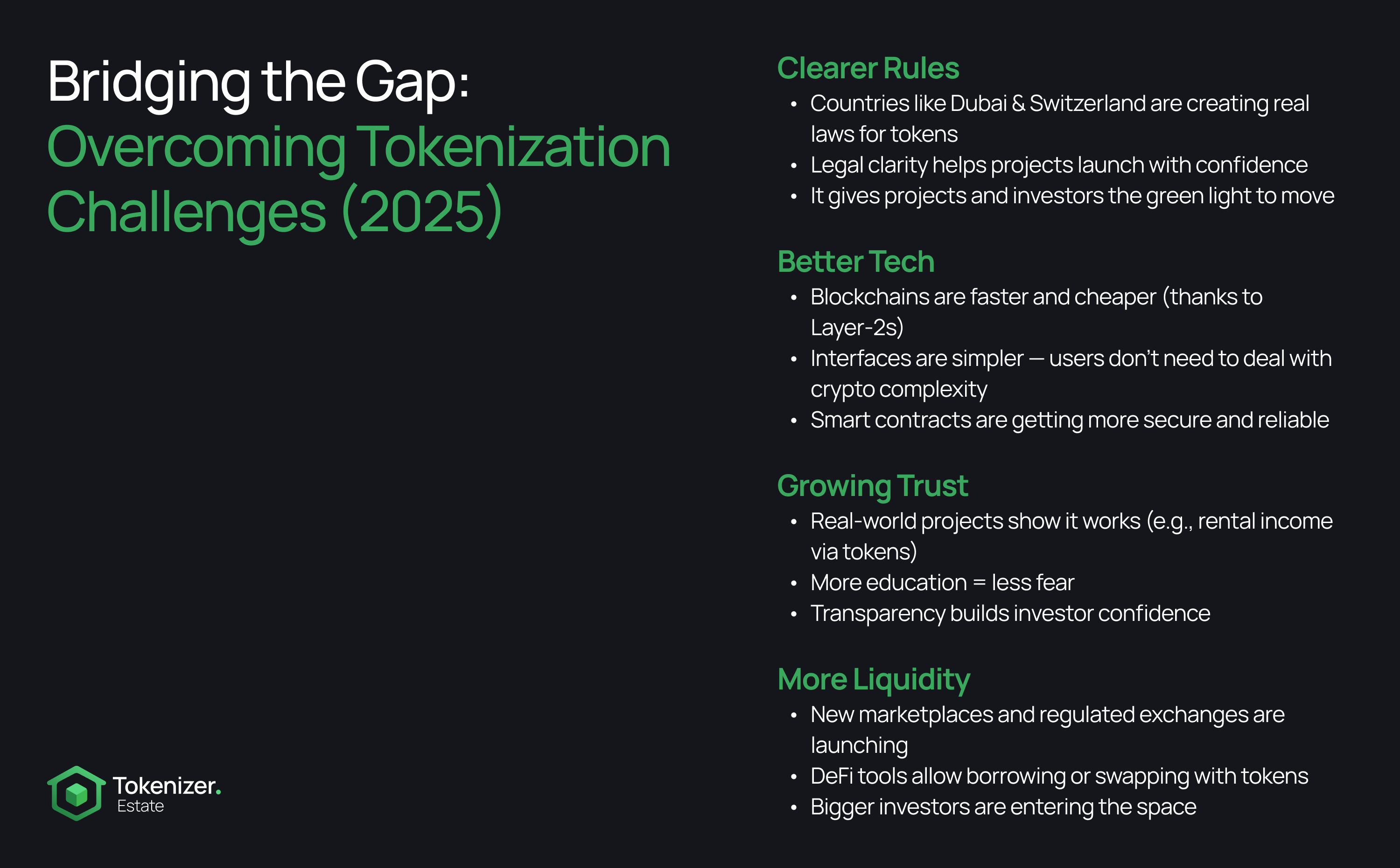Real estate tokenization in 2025 sits at a crossroads of exciting opportunity and practical reality. The global context is encouraging: governments and big institutions are paying attention, and some are even leading the charge (for example, Dubai’s government integrating blockchain into its property registry, or major banks participating in tokenized offerings). These efforts show that the challenges above are not insurmountable. In fact, they highlight exactly how to move forward: