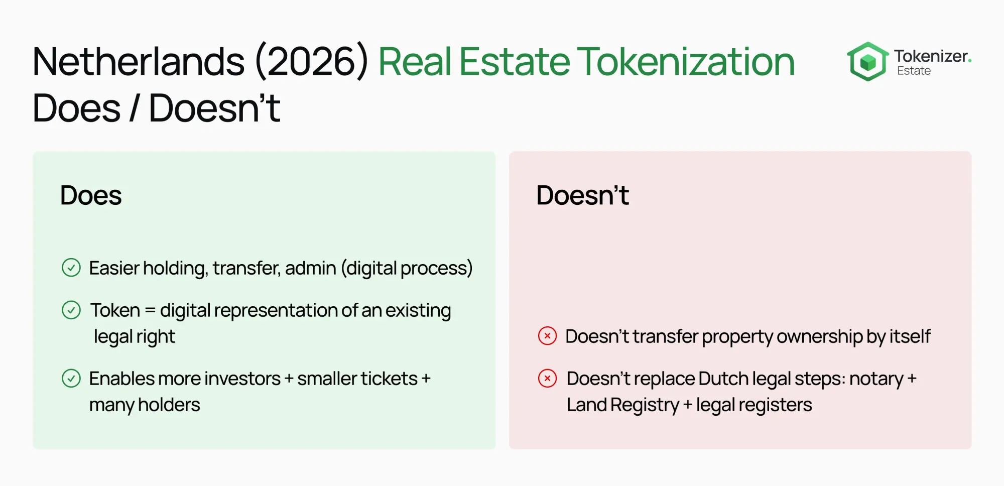 The first hard limit is property ownership. In the Netherlands, legal ownership of real estate moves when a civil-law notary registers a notarial transfer deed in the Land Registry (Kadaster). A token transfer does not update the Kadaster record, and it does not create legal delivery by itself. For the clean source statement, Kadaster explains that recording the notarial deed is the mandatory step for a change in the legal status of registered property.