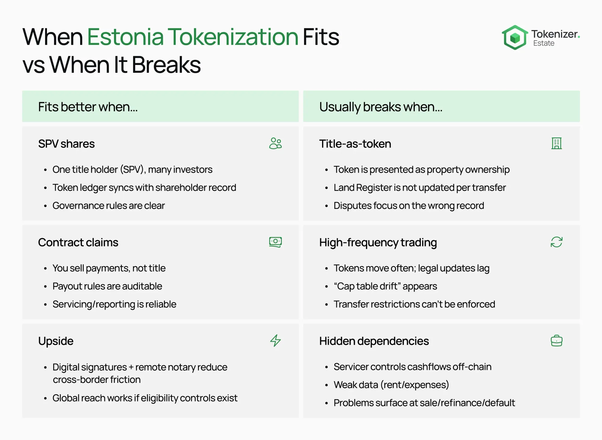 So what changes in practice? The safest scope is usually narrower than the first product idea. Instead of “token = title,” teams do better with “token = shares in a property SPV” or “token = a clear contractual claim,” plus strict rules for how token state stays consistent with legal state.