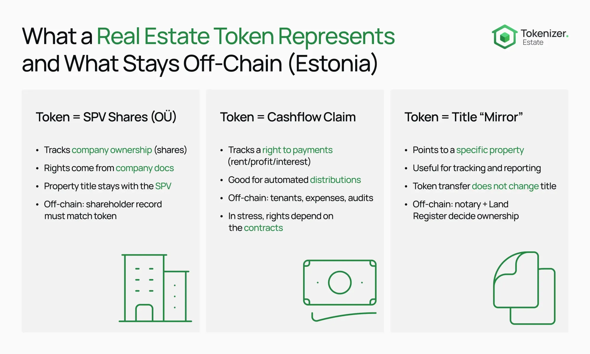 Tokenization means you take an existing right and represent it with a token. The plan is that holding and transferring the token tracks who holds that right. In real estate, the right is usually one of three things: (1) company shares in a property-holding SPV, (2) a contractual claim linked to cashflow, or (3) a “mirror” reference to property title.
