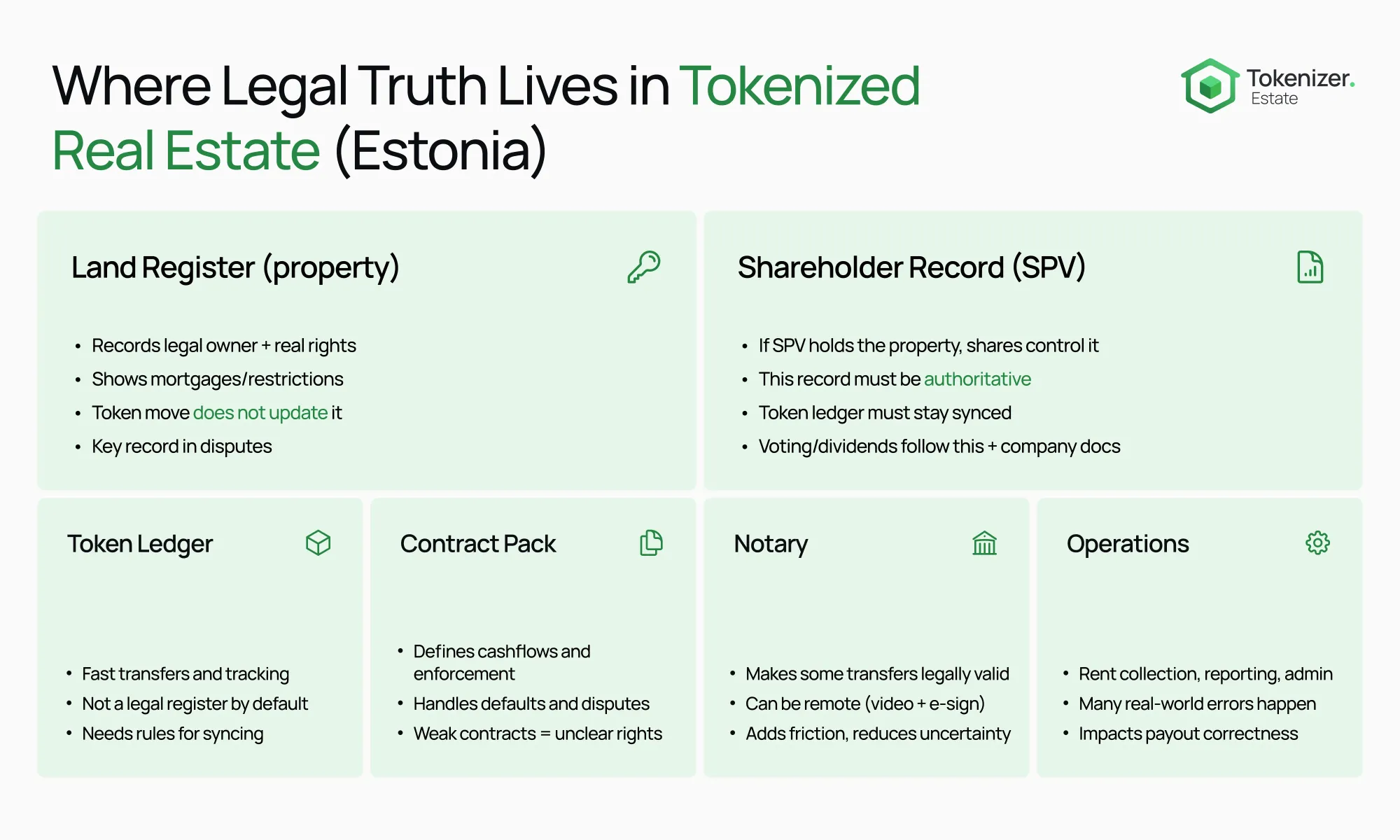 The first hard limit is property title. In Estonia, ownership and other real rights over an immovable are tied to notarial acts and the land register record. A token transfer does not, by itself, change the land register entry.